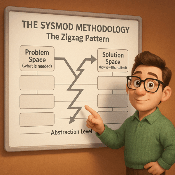 The SYSMOD methodology includes the Zigzag Pattern, which describes the zigzagging between the problem space (what is needed) and the solution space (how it will be realized). The following illustrates a basic framework of the problem-solution zigzag across several abstraction …